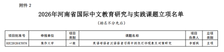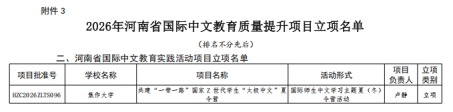 近日,球王会平台正式公布了2026年河南省优质国际化课程等有关项目立项名单的通知,球王会平台荣获两项立项,其中李丽枫老师主持的《英语母语者汉语语音习得中的负迁移现象及对策研究》获批河南省国际中文教育研究与实践课题项目、卢静老师主持的《共建“一带一路”国家Z世代学生“太极中文”夏令营》获批河南省国际中文教育实践活动项目。