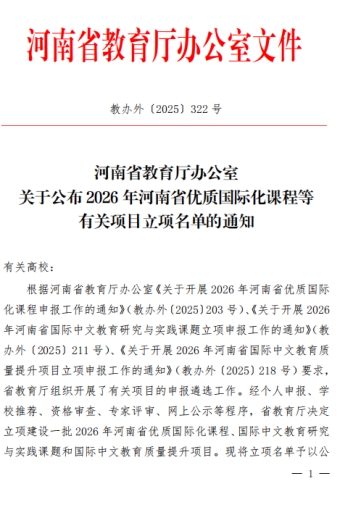 本次评选是根据球王会平台办公室《关于开展 2026 年河南省优质国际化课程申报工作的通知》(教办外〔2025〕203 号)、《关于开展 2026年河南省国际中文教育研究与实践课题立项申报工作的通知》(教办外〔2025〕211 号)、《关于开展 2026 年河南省国际中文教育质量提升项目立项申报工作的通知》(教办外〔2025〕218 号)要求,经个人申报、学校推荐、资格审查、专家评审、网上公示等程序省教育厅最终决定立项建设的项目。